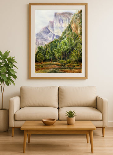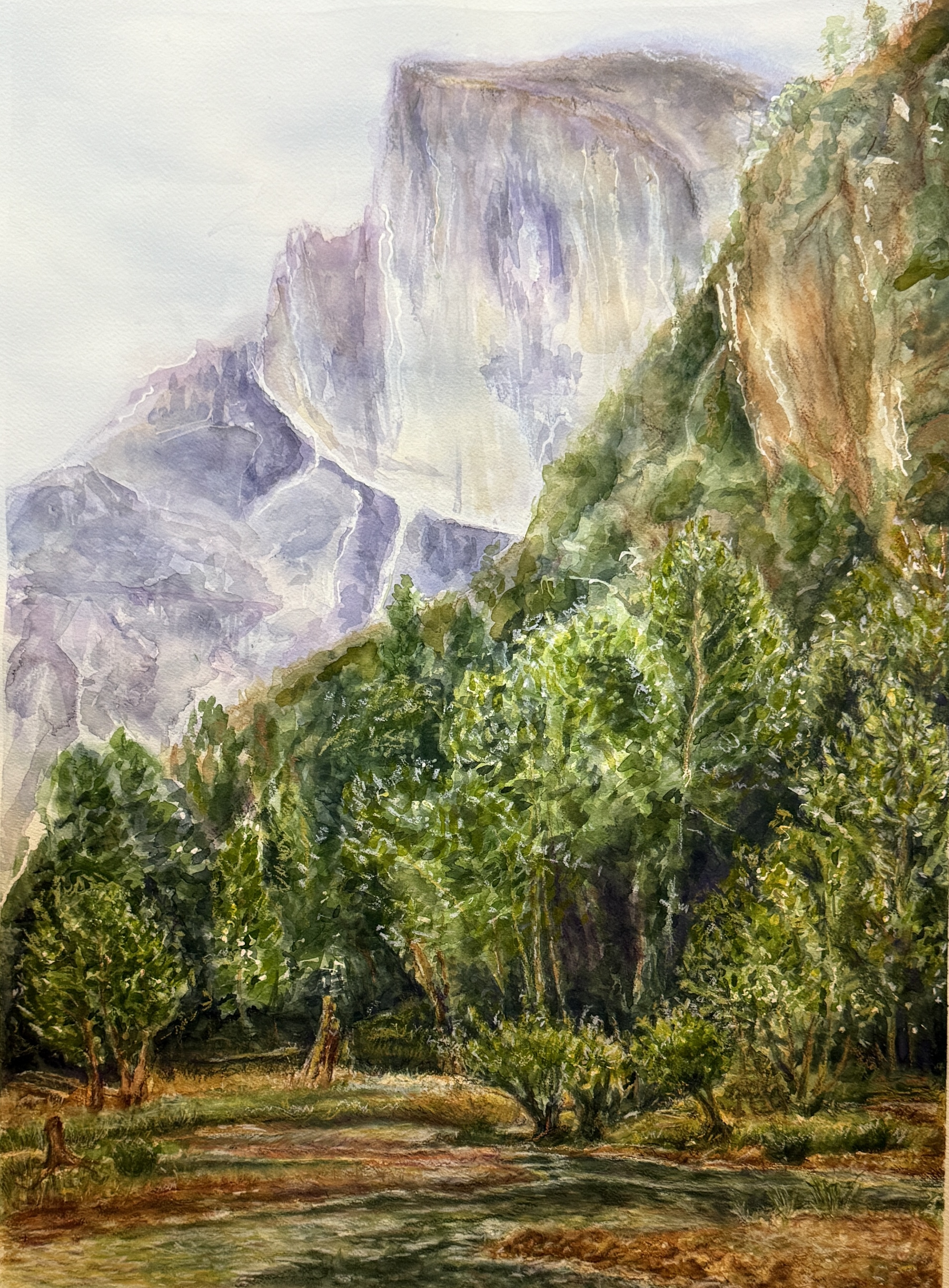 # Echoes of Yosemite brings the Valley’s iconic landscape to life through layered watercolor, pencil, and gouache—capturing granite, forest light, and atmospheric depth.